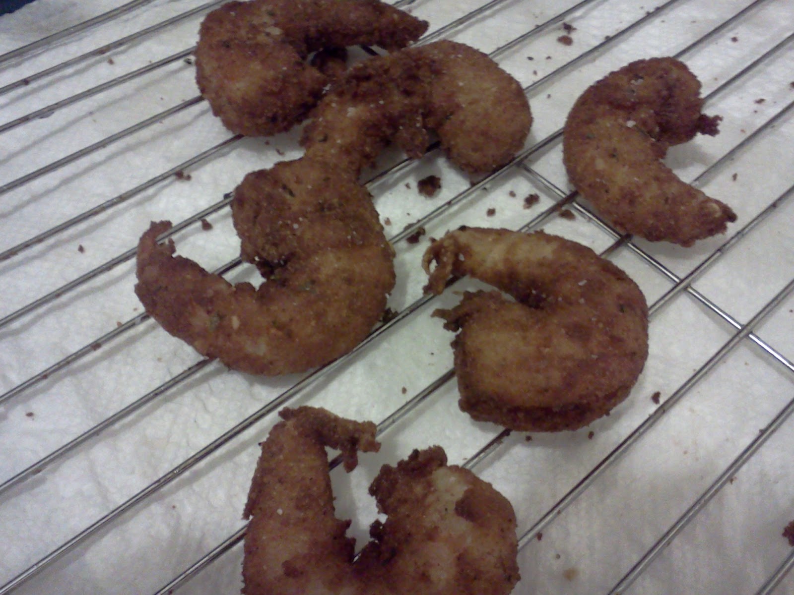 Remove the shrimp from the oil and place it on a wire rack with paper towel underneath to catch the excess oil. This helps keep the crust crispy on both sides. Nothing worse than making a really tasty crust to have it be mushy and oil soaked.